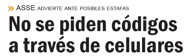 Mediante varias consultas a la Administración de Salud de Servicios del Estado por llamadas telefónicas o mensajes vía Whatsapp, ASSE dejan constancia, una vez más, que desde la institución no solicita ningún código a usuarios/as en particular ni a la población en general. En el último año, varias veces se ha utilizado el nombre de ASSE para realizar estafas a través del celular.